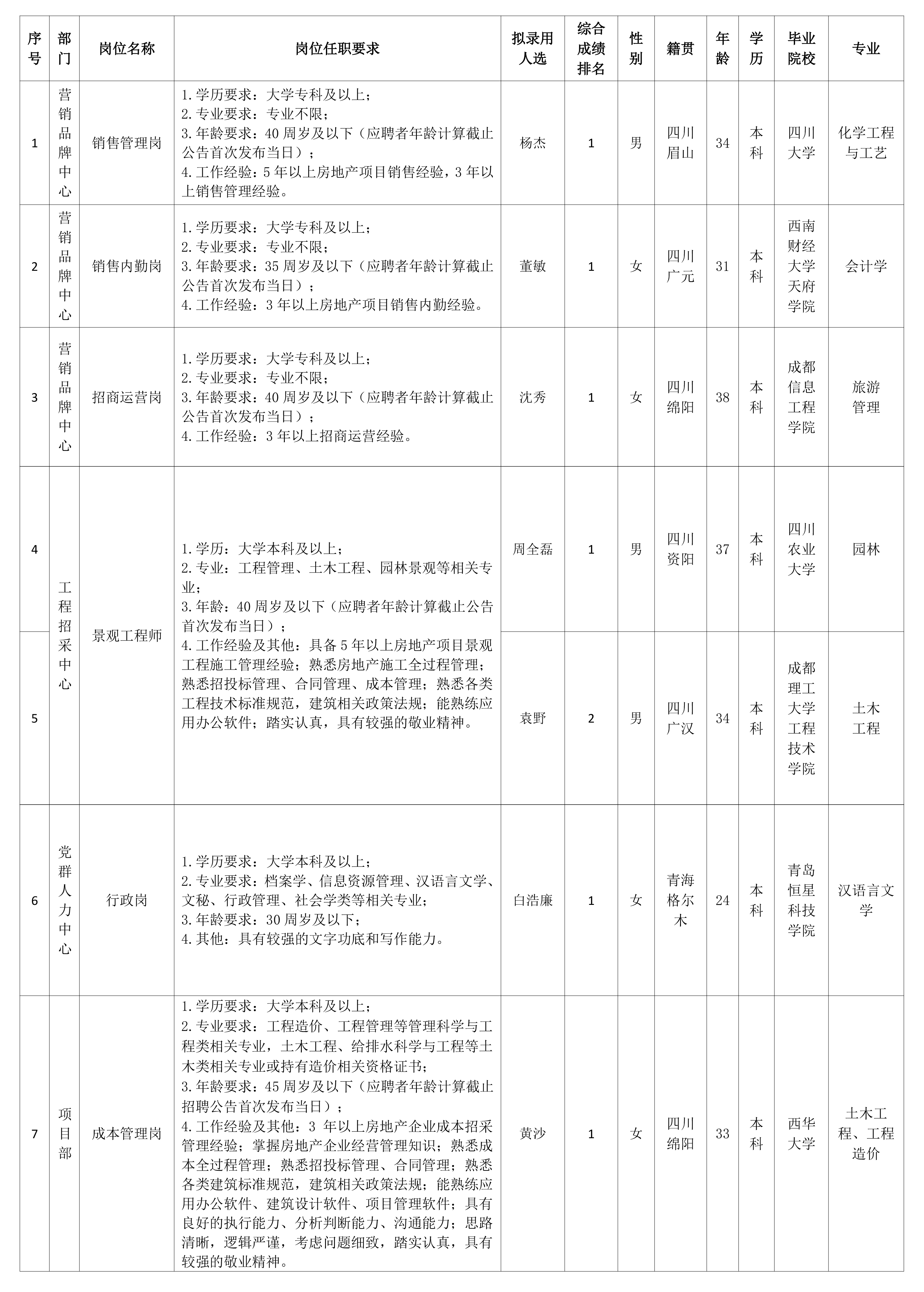 根据绵阳市绵投置地有限公司发布的招聘公告及招聘相关规定,经笔试、面试、考察、体检等程序,拟录用杨杰等同志到绵阳市绵投置地有限公司工作,现予以公示,具体情况如下: