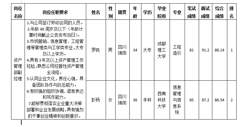 根据绵阳市绵投商业运营管理有限责任公司发布的竞聘公告及竞聘相关规定,经笔试、面试等程序,现将笔试(面试)成绩予以公示。