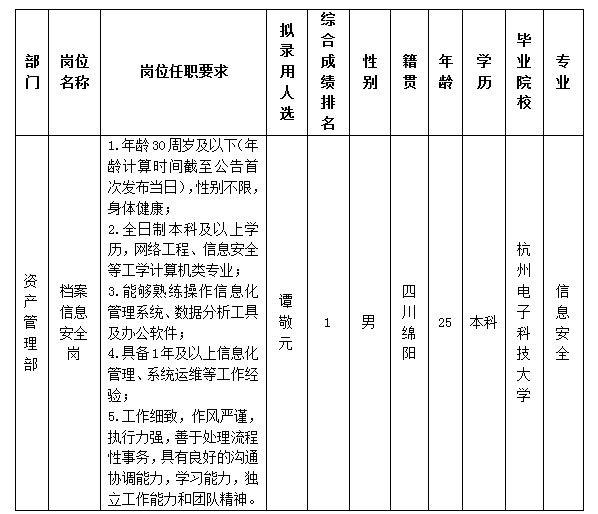 根据绵阳市绵投商业运营管理有限责任公司发布的招聘公告及招聘相关规定,经笔试、面试、背景调查、体检等程序,拟录用谭敬元同志到绵阳市绵投商业运营管理有限责任公司工作,现予以公示,具体情况如下: