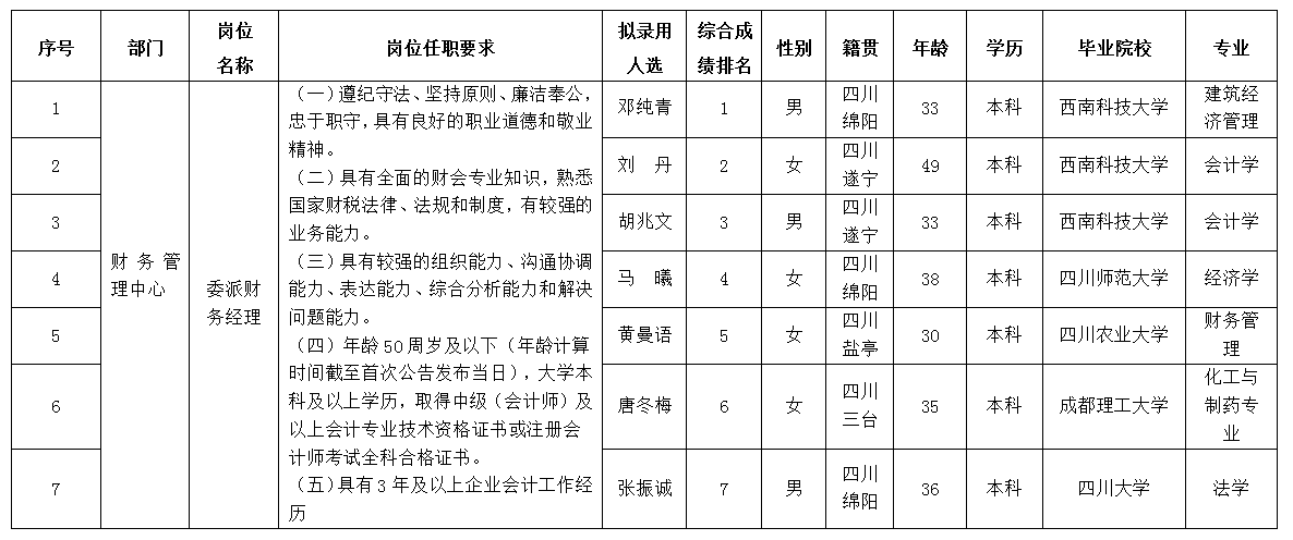 根据绵阳市投资控股(集团)有限公司发布的招聘公告及招聘相关规定,经笔试、面试、考察等程序,拟录用邓纯青等同志作为集团委派财务经理岗位拟录用人员,现予以公示,具体情况如下: