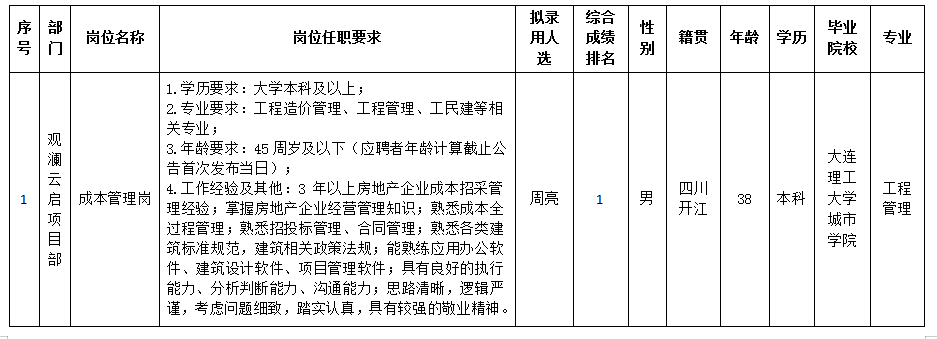 根据绵阳市绵投置地有限公司发布的招聘公告及招聘相关规定,经笔试、面试、考察、体检等程序,拟录用周亮同志到绵阳市绵投置地有限公司工作,现予以公示,具体情况如下: