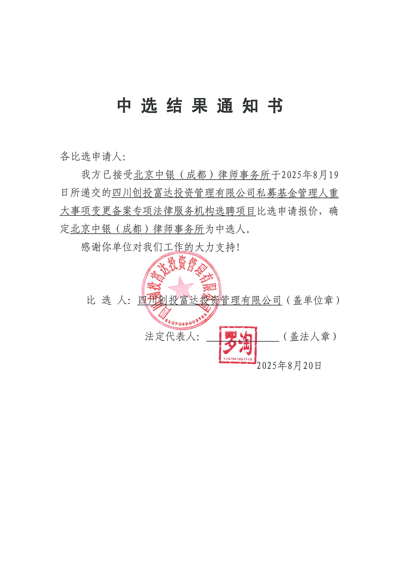 创投富达私募基金管理人重大事项变更备案专项法律服务机构选聘中选结果通知