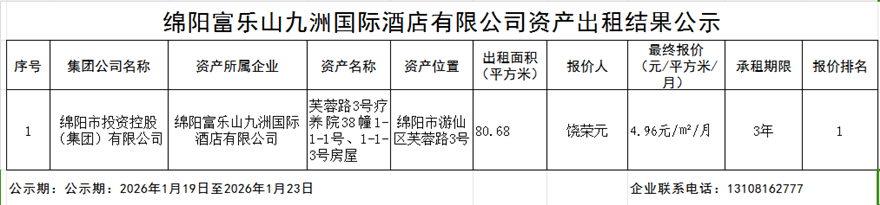 绵阳富乐山九洲国际酒店有限公司资产出租结果公示