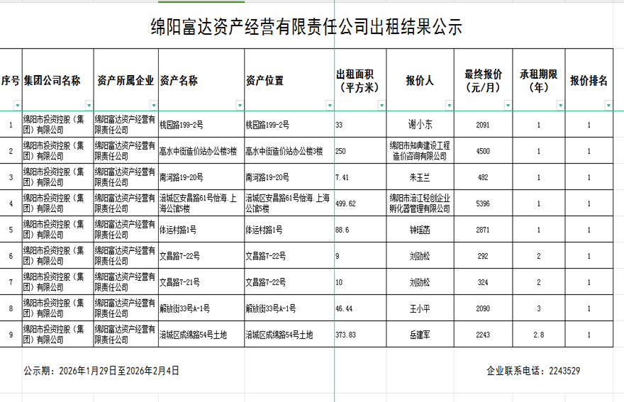 绵阳富达资产经营有限责任公司资产出租结果公示
