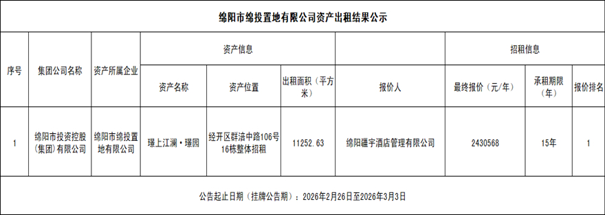 绵阳市绵投置地有限公司资产出租结果公示