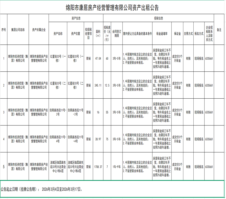 绵阳市康居房产经营管理有限公司资产出租公告