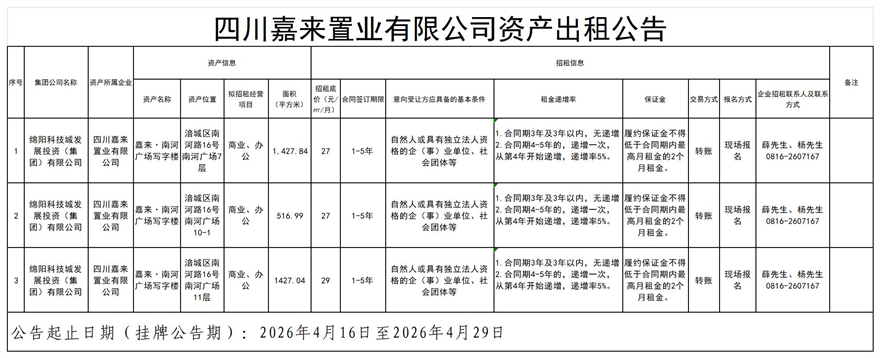四川嘉来置业有限公司资产出租公告
