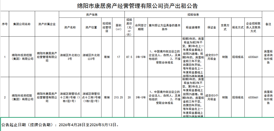 绵阳市康居房产经营管理有限公司资产出租公告