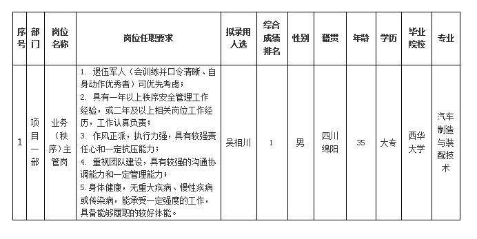 根据绵阳市康来物业服务有限公司发布的招聘公告及招聘相关规定,经笔试、面试、背景调查等程序,拟录用吴相川同志到绵阳市康来物业服务有限公司工作,现予以公示,具体情况如下: