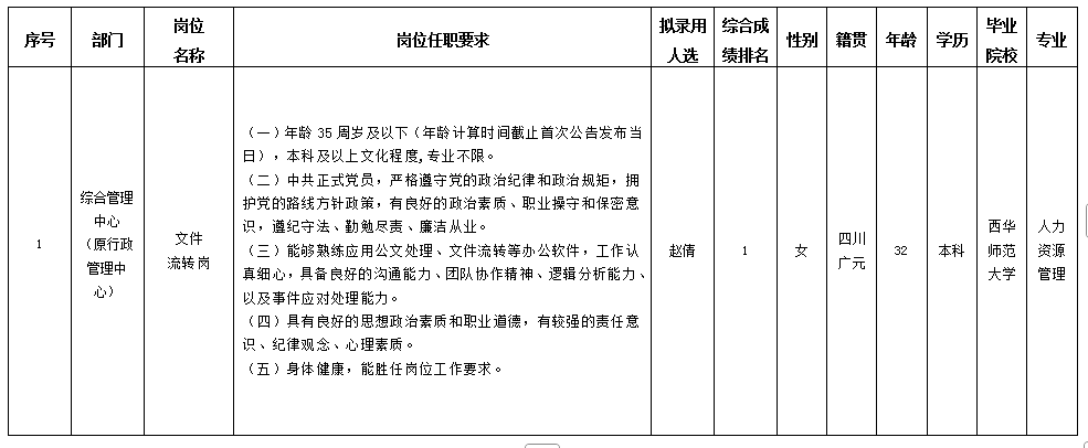 根据绵阳市投资控股(集团)有限公司发布的招聘公告及招聘相关规定,经笔试、面试、背调等程序,拟录用赵倩同志到绵阳市投资控股(集团)有限公司工作,现予以公示,具体情况如下:
