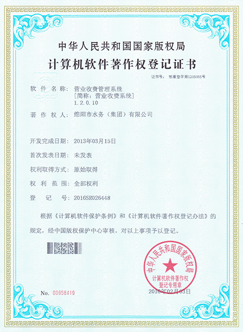 近日,由集团所属绵阳水务集团自主研发的营业收费系统获得国家版权局计算机软件著作权登记证书。这标志着绵阳水务集团在拥有自主知识产权方面实现零的突破。