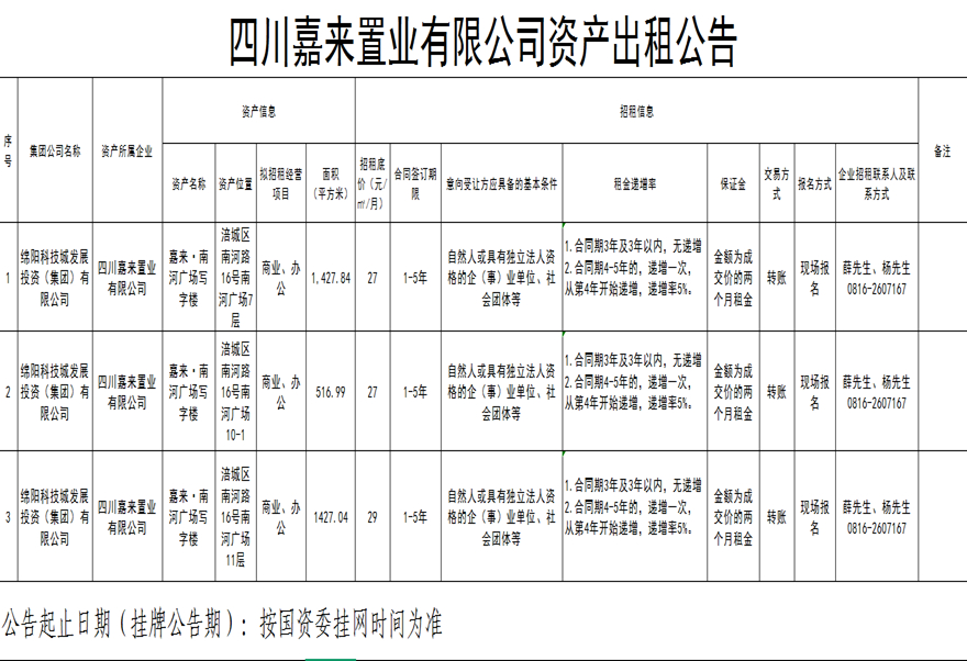 四川嘉来置业有限公司资产出租公告