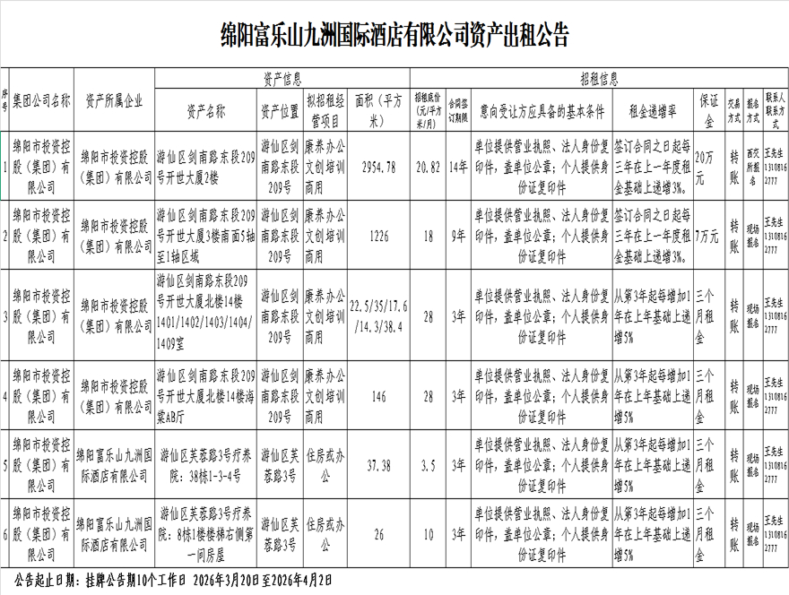 绵阳富乐山九洲国际酒店有限公司资产出租公告