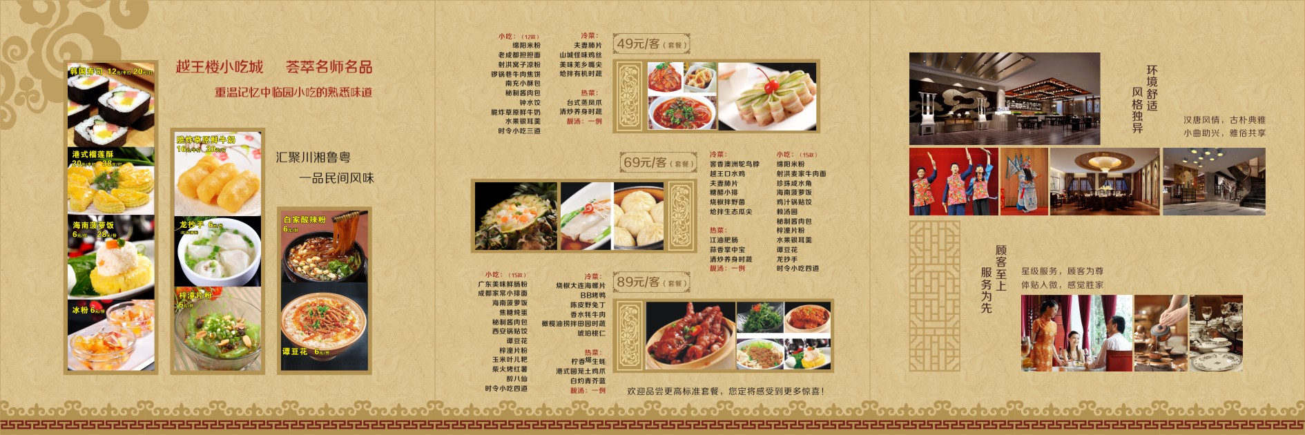 名楼,名师,名品。越王楼小吃城以弘扬中华名优小吃为己任,小吃价格6元/份起,小吃套餐49元/客起,雅俗共赏,丰俭由人。