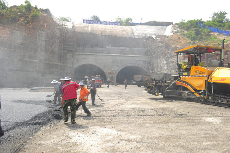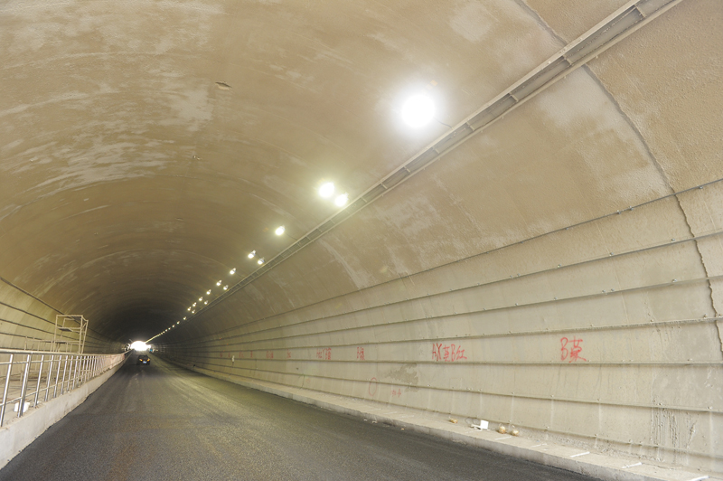 目前,工人们正在浇注沥青,整个隧道双拱已经打通,隧道内的车行道路面新铺了沥青,两车道的地面标线已经划出来。工人们正在安装隧道内的隔层材料,还有工人正对左右隧道照明设施进行安装调试。隧道内的车行道旁边还有一处宽阔的非机动车道,工人们正在上边贴地砖。