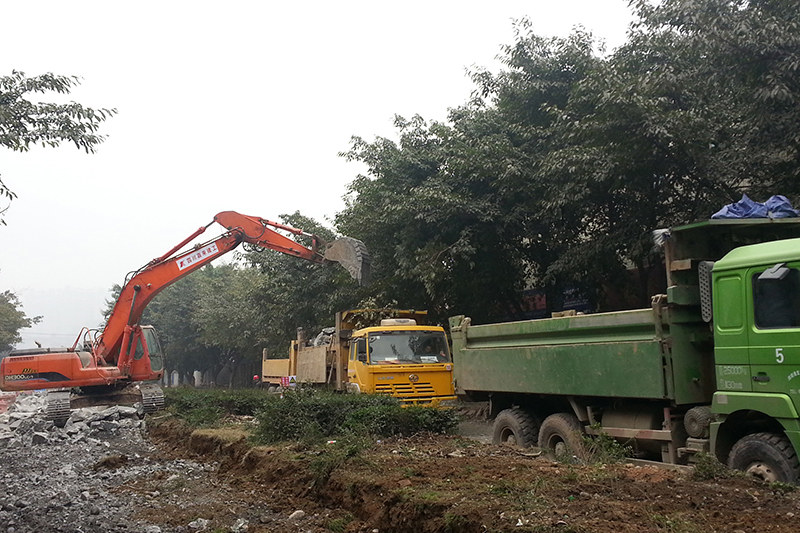 余台器械正在现有工作面加紧施工,原有老旧路面破碎基本完成,节日期间正加紧进行现场清运、围挡布置等。下一步计划进行排洪渠开挖等施工作业。