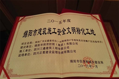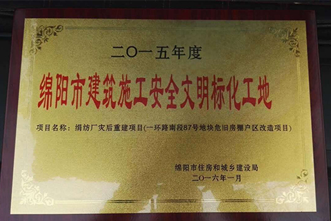 1月13日,经各参建单位的共同努力,由集团所属四川嘉来置业公司全程实施管理的绵阳市绢纺厂灾后重建项目荣获2015年度绵阳市建筑施工安全文明标化工地奖,该奖项由绵阳市住房与城乡建设局颁发。