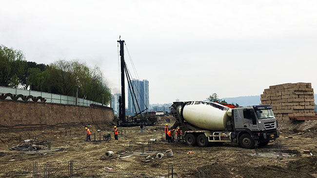 一边是建围堰,一边是打桩基。在项目配套用房1-5号区域内,打桩机械轰鸣,约200根混凝土桩基已完工。据介绍,与其他普通施工不同,因为河滩地地质松软,因此在建设配套用房前需要进行预应力管桩基础作业。通俗的讲,就是依靠打桩基来提高建设房屋的稳定性。