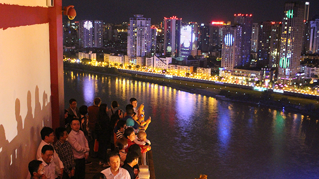 “绵州州府何磊落,显庆年中越王作。孤城西北起高楼,碧瓦朱甍照城郭。”带着诗中的期许,5月26日晚20:30,“名家看绵阳”文艺采风创作活动艺术家代表团在市委、市府领导张学民、黄正良、经大忠、艾尚林等人的陪同下登临唐代四大名楼之一的越王楼,鉴赏绚烂华丽的古建风采,体味浓郁的文化气息,重温古人临江远眺的浪漫情怀。