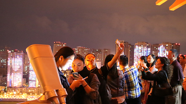 参访团登临越王楼的最高处十五楼极目远眺,涪江两岸灯火通明,一派生机勃勃景象。对岸所有临江楼宇仿佛变成一幅巨大的电子屏幕。一朵朵娇艳的鲜花在高层建筑上慢慢绽放,一片片绿叶飘零而下,随后画面转换成连绵起伏的山峦丘陵,配合优美的背景音乐,宛如一幅美丽画卷在眼前展开,没有边际。“眼前的高科技灯光秀,脚下的历史古建,站在越王楼上看,现代和古典完美的结合在一起了,一定要点个赞!”几位正在自拍的青年女团员不吝称赞到。