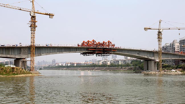 目前,虹云桥桥梁上部结构的10个标准节段箱梁已施工完成,合龙段钢筋和模板安装作业已经全部完成,在技术工人精准的操作下,合龙段混凝土施工顺利推进,标志着主桥成功合龙。