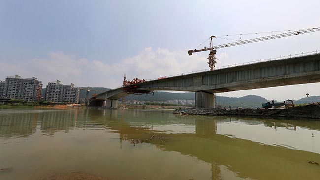连接桃花岛和沈家坝片区的虹云桥,是市政基础设施重点项目之一。项目起于桃花岛,上跨涪江、芙蓉路,终点接绵盐路,桥梁全长497米。其中主桥设计为83米+110米+83米三跨波形钢腹板连续梁;桥梁宽度18米,设计行车时速20公里。项目建成通车后将加强城南片区与沈家坝片区的交通联系,改善桃花岛片区的出行条件,缓解涪江三桥的交通压力。