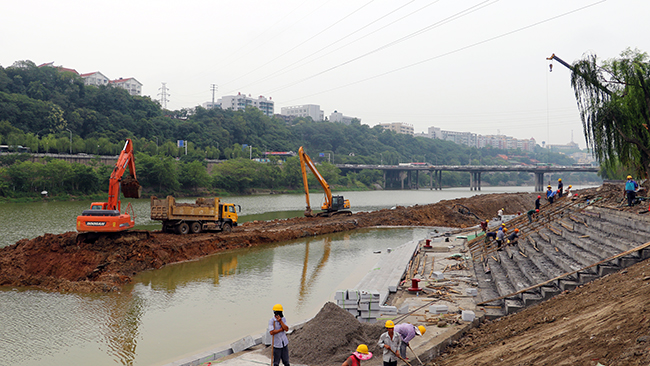 同时,为确保现场施工安全,项目管理部提前制定防汛应急预案,每天晚上施工完毕,都要求将作业区机械材料运至安全区域,工地上设有24小时防汛安全巡逻员,同时和上游水文部门建立了天气预报联动机制,上游一下雨涨水,下游施工方将及时得到通知。现场也设有多处水文观测点,时刻注意水位变化,确保项目在保障主汛期施工安全的前提下按照既定时间节点完成项目建设。