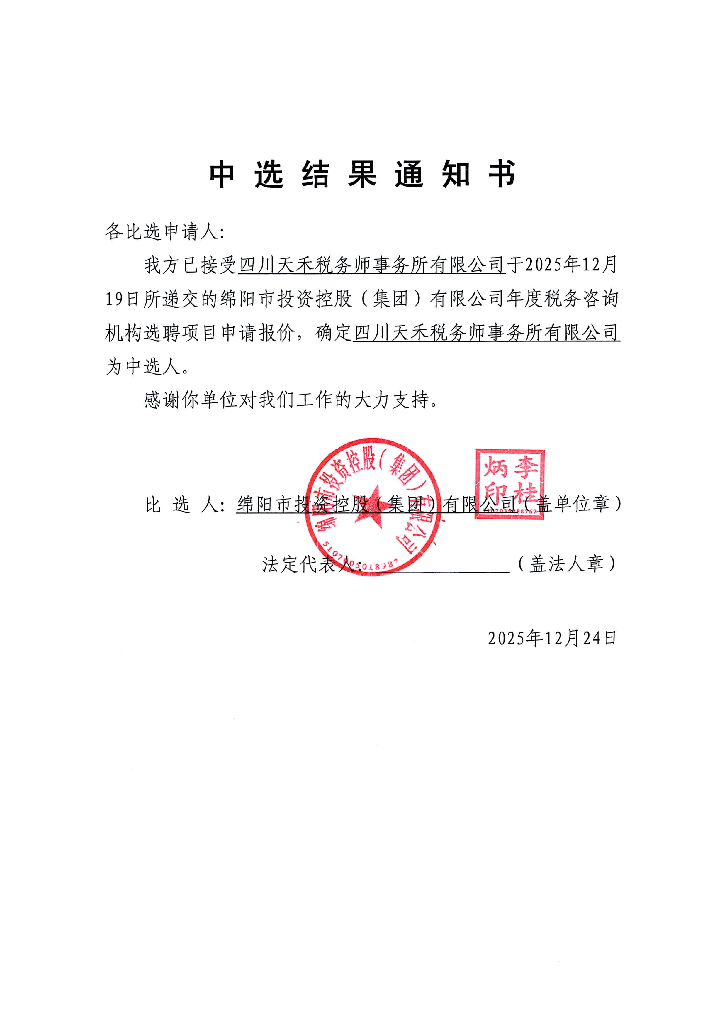 绵阳市投资控股(集团)有限公司年度税务咨询机构选聘项目中选结果通知