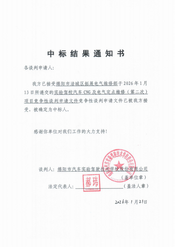 实验驾校汽车CNG及电气定点维修项目中标结果通知