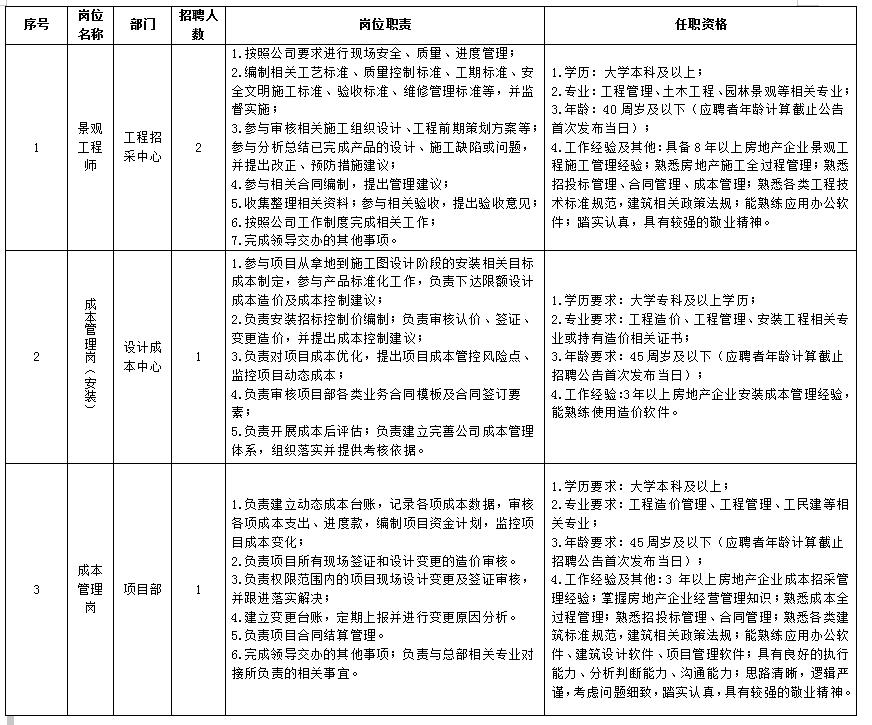 (1)年龄30岁-40岁,大学本科及以上相关专业学历,有园林景观五年以上工作经验,有工程师及以上职称。具有全国注册监理工程师(机电安装)者优先。条件优秀者可适当放宽。